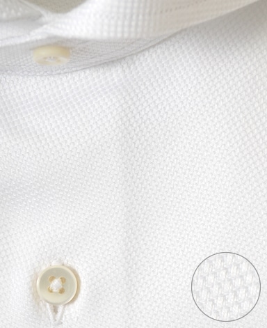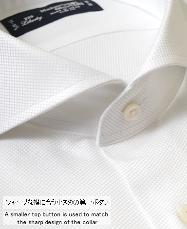 ■襟の表裏のパターンに差をつけ、コンパクトかつ構築的な襟を実現。品の良いドレスシャツの証である、首に巻きつくような内巻きフォルムは、匠によるいせ込み技術の成果です。