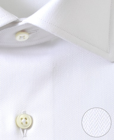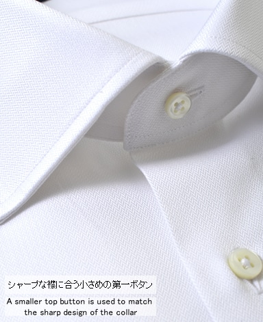 ■襟の表裏のパターンに差をつけ、コンパクトかつ構築的な襟を実現。品の良いドレスシャツの証である、首に巻きつくような内巻きフォルムは、匠によるいせ込み技術の成果です。