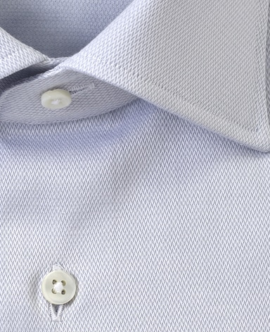 ■襟の表裏のパターンに差をつけ、コンパクトかつ構築的な襟を実現。品の良いドレスシャツの証である、首に巻きつくような内巻きフォルムは、匠によるいせ込み技術の成果です。