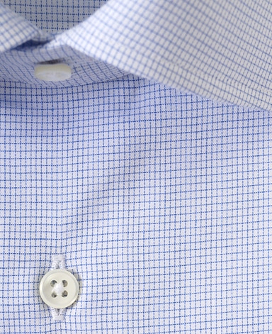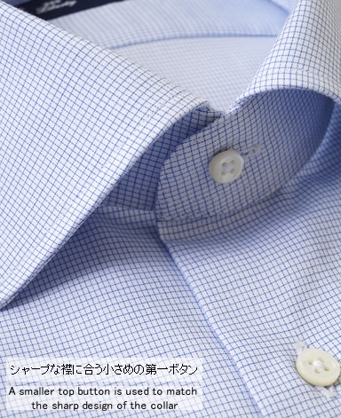 ■襟の表裏のパターンに差をつけ、コンパクトかつ構築的な襟を実現。品の良いドレスシャツの証である、首に巻きつくような内巻きフォルムは、匠によるいせ込み技術の成果です。