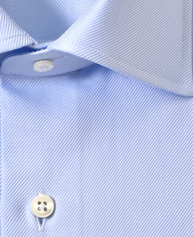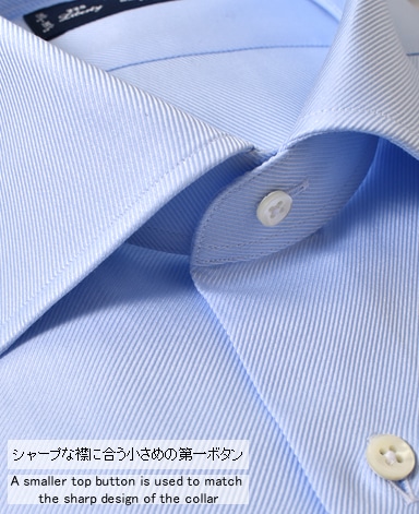 ■襟の表裏のパターンに差をつけ、コンパクトかつ構築的な襟を実現。品の良いドレスシャツの証である、首に巻きつくような内巻きフォルムは、匠によるいせ込み技術の成果です。