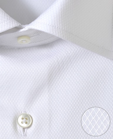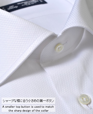 ■襟の表裏のパターンに差をつけ、コンパクトかつ構築的な襟を実現。品の良いドレスシャツの証である、首に巻きつくような内巻きフォルムは、匠によるいせ込み技術の成果です。