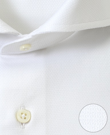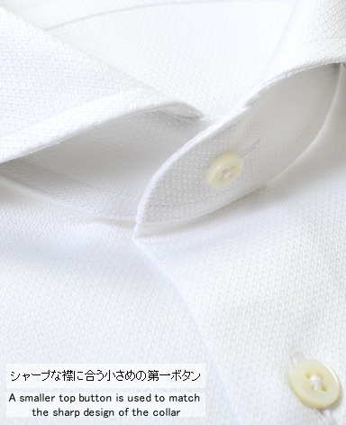 ■襟の表裏のパターンに差をつけ、コンパクトかつ構築的な襟を実現。品の良いドレスシャツの証である、首に巻きつくような内巻きフォルムは、匠によるいせ込み技術の成果です。