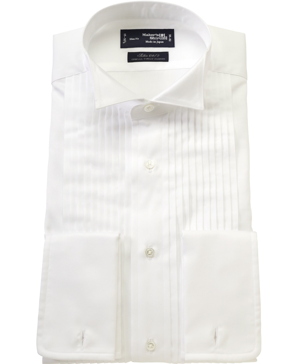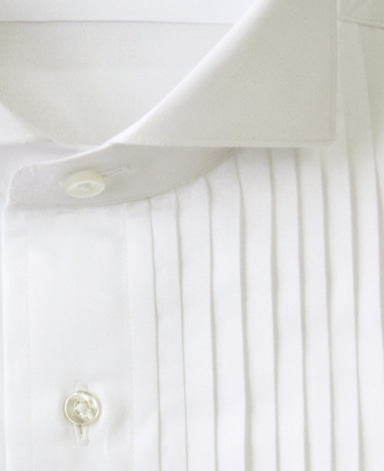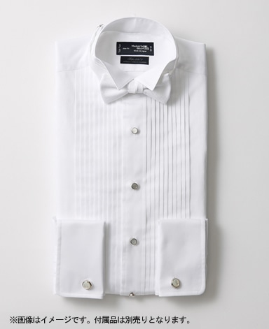 シャツ:プリーツ入りストレートカラー(又はウィングカラー)のフレンチカフスシャツ