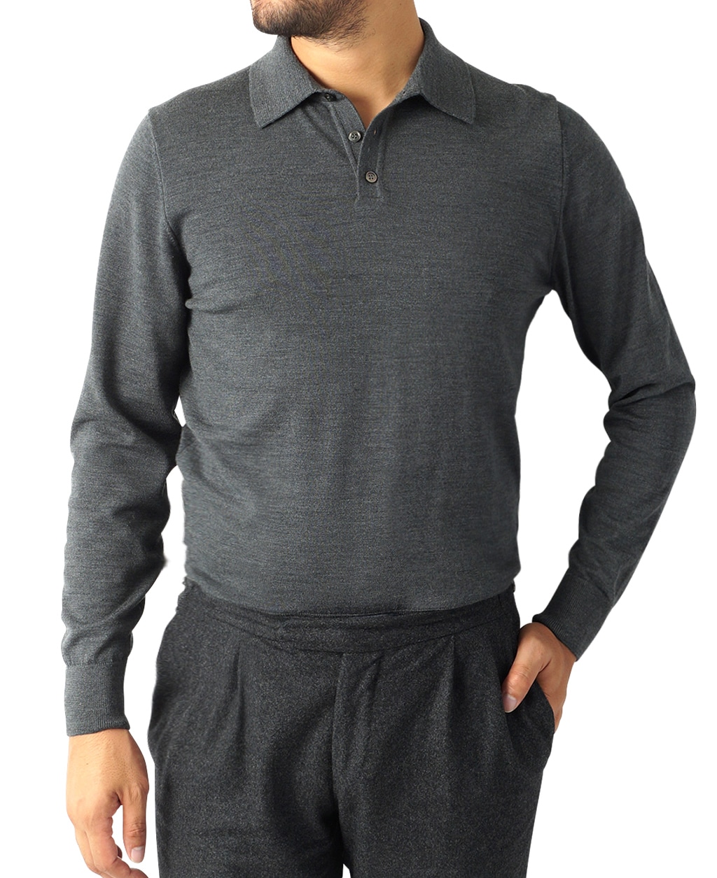 型紙通りに編んでからつなぎ合わせるフルファッションという特殊な製法で作られたウールニットポロシャツ。