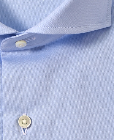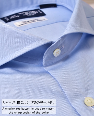 ■襟の表裏のパターンに差をつけ、コンパクトかつ構築的な襟を実現。品の良いドレスシャツの証である、首に巻きつくような内巻きフォルムは、匠によるいせ込み技術の成果です。