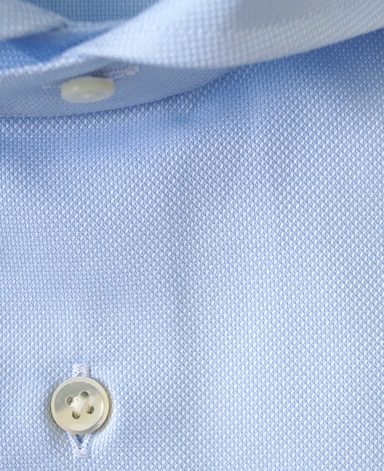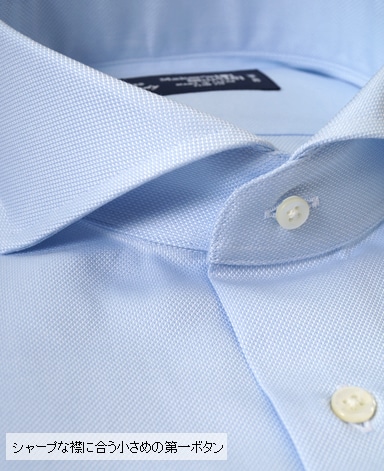 ■襟の表裏のパターンに差をつけ、コンパクトかつ構築的な襟を実現。品の良いドレスシャツの証である、首に巻きつくような内巻きフォルムは、匠によるいせ込み技術の成果です。