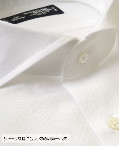 ■襟の表裏のパターンに差をつけ、コンパクトかつ構築的な襟を実現。品の良いドレスシャツの証である、首に巻きつくような内巻きフォルムは、匠によるいせ込み技術の成果です。