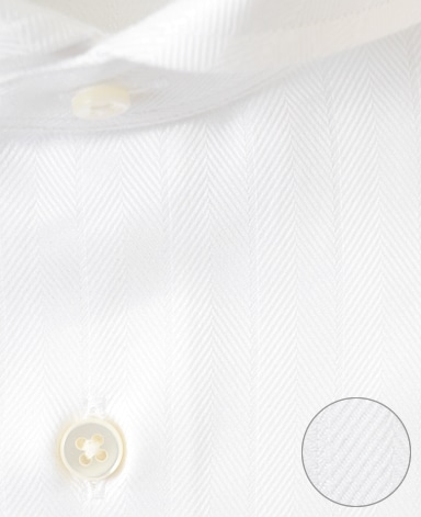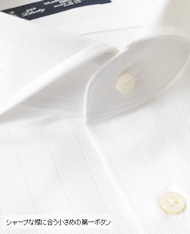 ■襟の表裏のパターンに差をつけ、コンパクトかつ構築的な襟を実現。品の良いドレスシャツの証である、首に巻きつくような内巻きフォルムは、匠によるいせ込み技術の成果です。