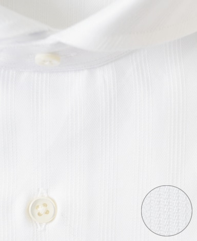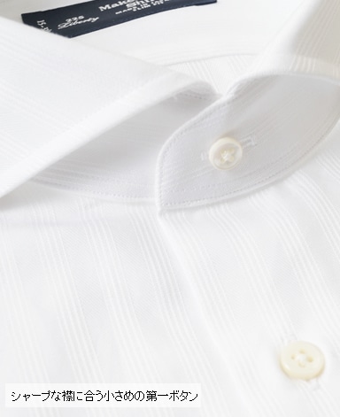 ■襟の表裏のパターンに差をつけ、コンパクトかつ構築的な襟を実現。品の良いドレスシャツの証である、首に巻きつくような内巻きフォルムは、匠によるいせ込み技術の成果です。
