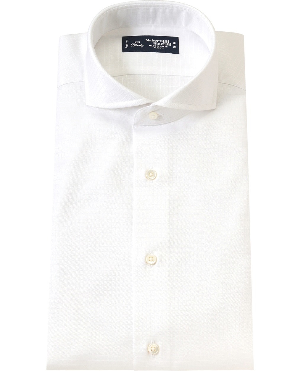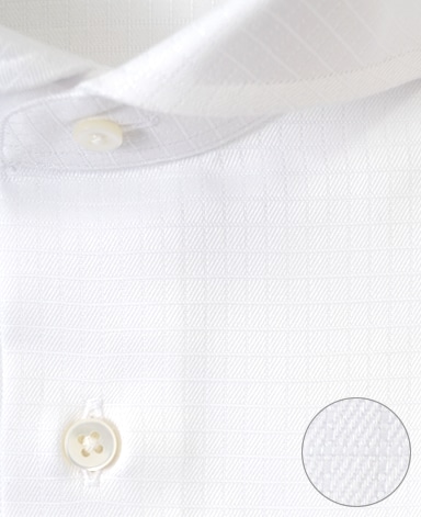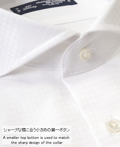 ■襟の表裏のパターンに差をつけ、コンパクトかつ構築的な襟を実現。品の良いドレスシャツの証である、首に巻きつくような内巻きフォルムは、匠によるいせ込み技術の成果です。