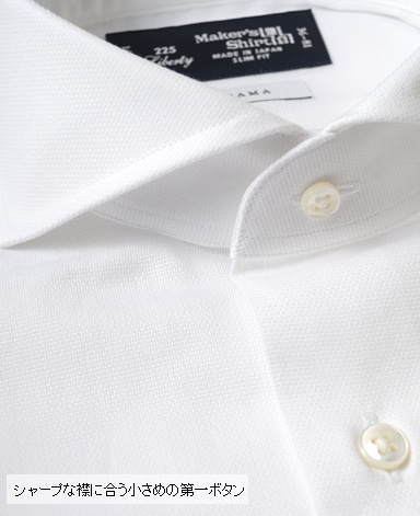 通常針目は3cmに18針以上で高級とされていますが、私たちのシャツは21針で縫い上げられています。また、耐久性に優れた「巻き伏せ本縫い」でシャツを仕立てています。