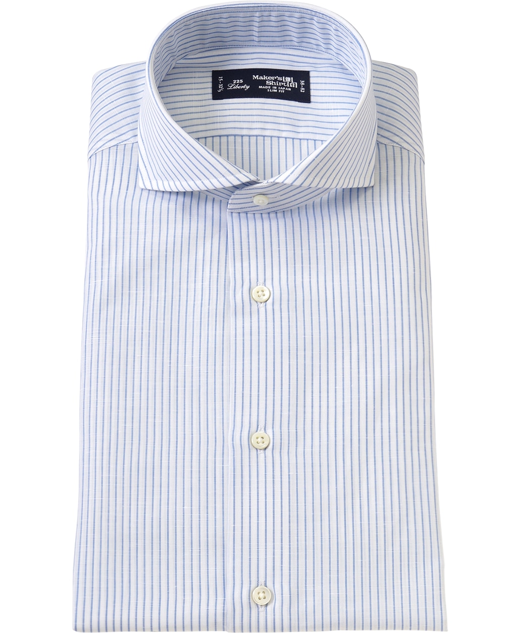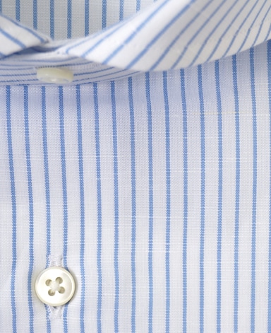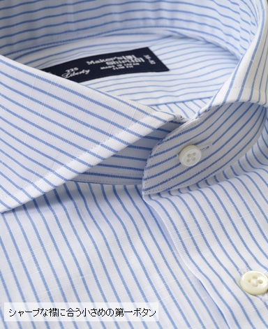 ■襟の表裏のパターンに差をつけ、コンパクトかつ構築的な襟を実現。品の良いドレスシャツの証である、首に巻きつくような内巻きフォルムは、匠によるいせ込み技術の成果です。