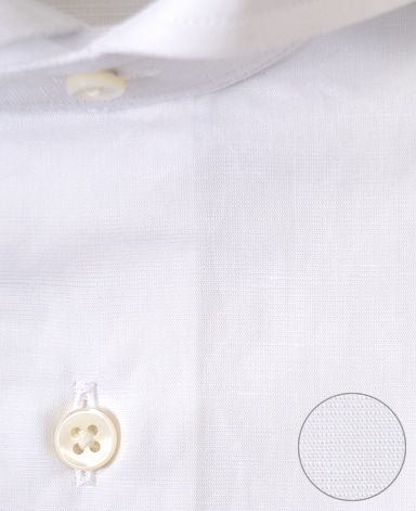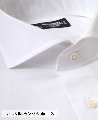 ■襟の表裏のパターンに差をつけ、コンパクトかつ構築的な襟を実現。品の良いドレスシャツの証である、首に巻きつくような内巻きフォルムは、匠によるいせ込み技術の成果です。