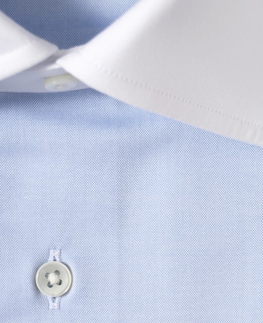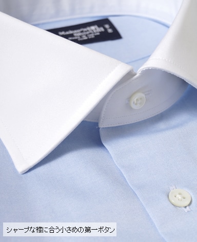 ■襟の表裏のパターンに差をつけ、コンパクトかつ構築的な襟を実現。品の良いドレスシャツの証である、首に巻きつくような内巻きフォルムは、匠によるいせ込み技術の成果です。