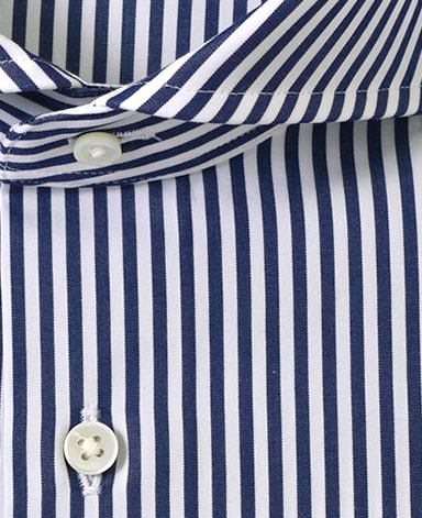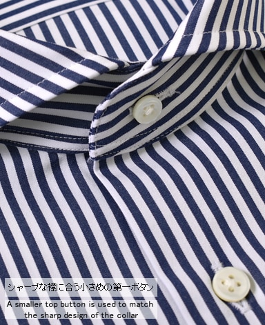■襟の表裏のパターンに差をつけ、コンパクトかつ構築的な襟を実現。品の良いドレスシャツの証である、首に巻きつくような内巻きフォルムは、匠によるいせ込み技術の成果です。