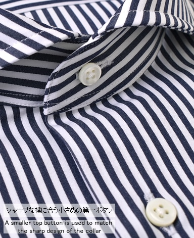 ■襟の表裏のパターンに差をつけ、コンパクトかつ構築的な襟を実現。品の良いドレスシャツの証である、首に巻きつくような内巻きフォルムは、匠によるいせ込み技術の成果です。