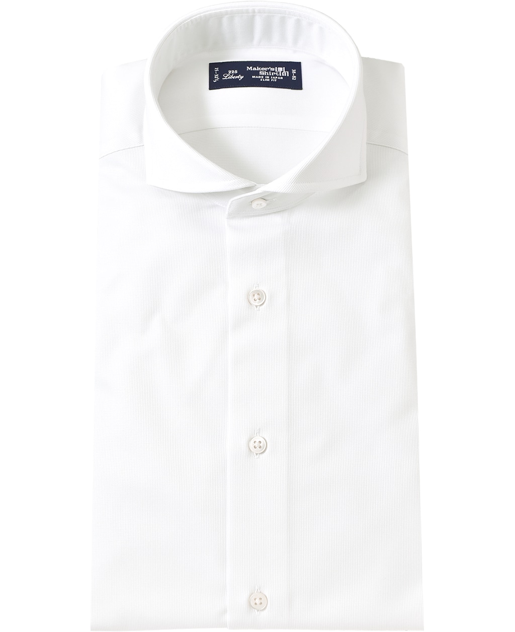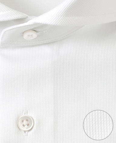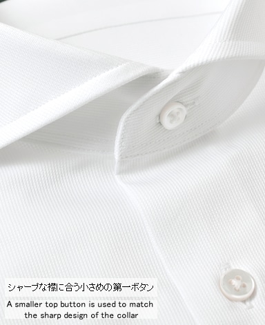 ■襟の表裏のパターンに差をつけ、コンパクトかつ構築的な襟を実現。品の良いドレスシャツの証である、首に巻きつくような内巻きフォルムは、匠によるいせ込み技術の成果です。