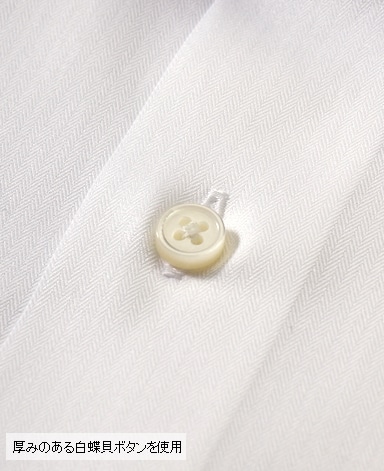 天然白蝶貝使用。その輝きは天然貝の最高級品として世界の高級ドレスシャツに使用されています。