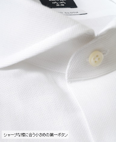 ■襟の表裏のパターンに差をつけ、コンパクトかつ構築的な襟を実現。品の良いドレスシャツの証である、首に巻きつくような内巻きフォルムは、匠によるいせ込み技術の成果です。