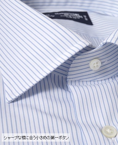 ■襟の表裏のパターンに差をつけ、コンパクトかつ構築的な襟を実現。品の良いドレスシャツの証である、首に巻きつくような内巻きフォルムは、匠によるいせ込み技術の成果です。