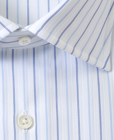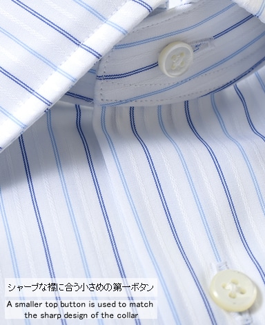■襟の表裏のパターンに差をつけ、コンパクトかつ構築的な襟を実現。品の良いドレスシャツの証である、首に巻きつくような内巻きフォルムは、匠によるいせ込み技術の成果です。