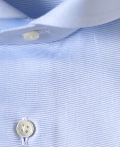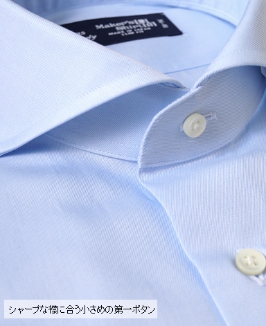 ■襟の表裏のパターンに差をつけ、コンパクトかつ構築的な襟を実現。品の良いドレスシャツの証である、首に巻きつくような内巻きフォルムは、匠によるいせ込み技術の成果です。