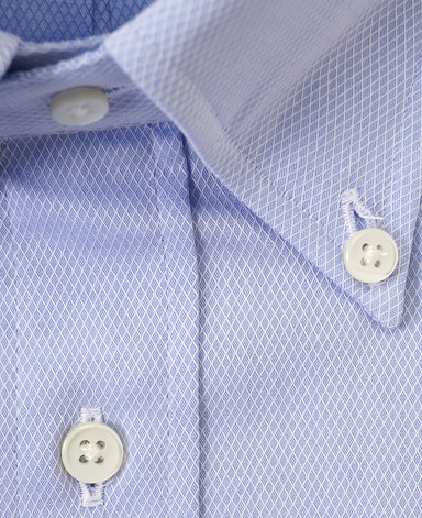 ■襟の表裏のパターンに差をつけ、コンパクトかつ構築的な襟を実現。品の良いドレスシャツの証である、首に巻きつくような内巻きフォルムは、匠によるいせ込み技術の成果です。