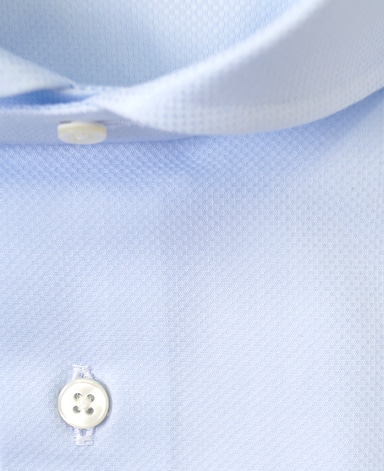 ■襟の表裏のパターンに差をつけ、コンパクトかつ構築的な襟を実現。品の良いドレスシャツの証である、首に巻きつくような内巻きフォルムは、匠によるいせ込み技術の成果です。