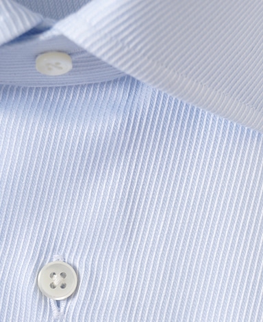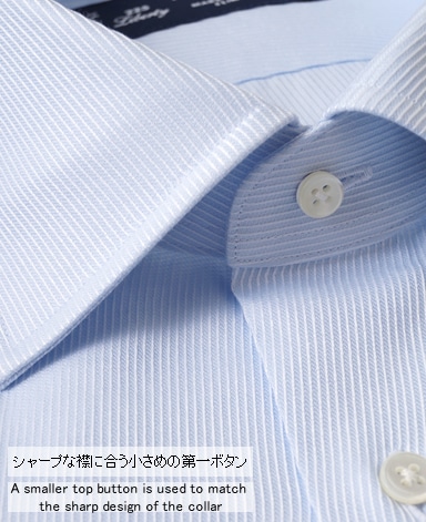 ■襟の表裏のパターンに差をつけ、コンパクトかつ構築的な襟を実現。品の良いドレスシャツの証である、首に巻きつくような内巻きフォルムは、匠によるいせ込み技術の成果です。