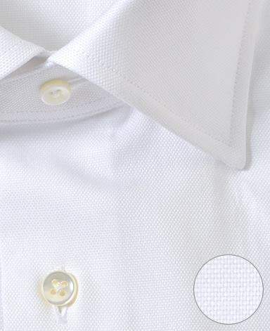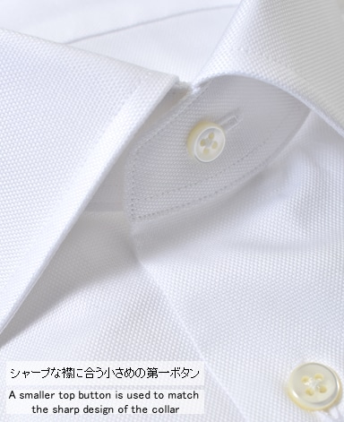 ■襟の表裏のパターンに差をつけ、コンパクトかつ構築的な襟を実現。品の良いドレスシャツの証である、首に巻きつくような内巻きフォルムは、匠によるいせ込み技術の成果です。