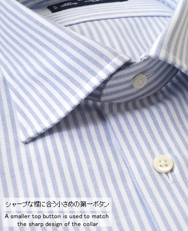 ■襟の表裏のパターンに差をつけ、コンパクトかつ構築的な襟を実現。品の良いドレスシャツの証である、首に巻きつくような内巻きフォルムは、匠によるいせ込み技術の成果です。