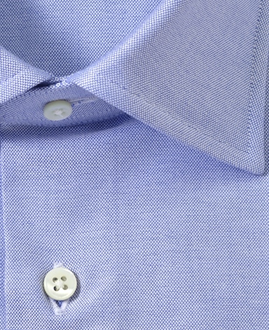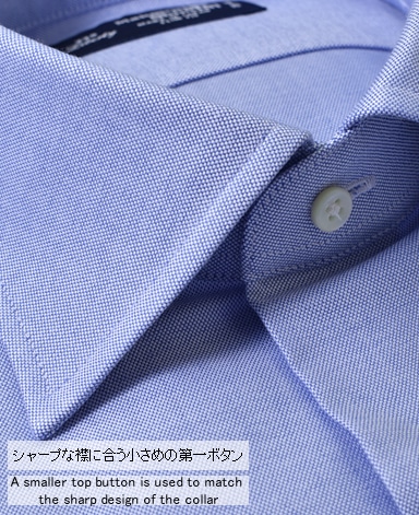 ■襟の表裏のパターンに差をつけ、コンパクトかつ構築的な襟を実現。品の良いドレスシャツの証である、首に巻きつくような内巻きフォルムは、匠によるいせ込み技術の成果です。