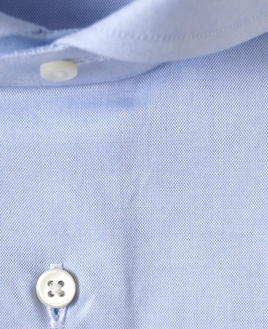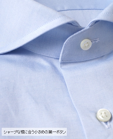 ■襟の表裏のパターンに差をつけ、コンパクトかつ構築的な襟を実現。品の良いドレスシャツの証である、首に巻きつくような内巻きフォルムは、匠によるいせ込み技術の成果です。