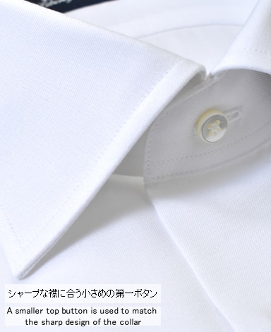 ■襟の表裏のパターンに差をつけ、コンパクトかつ構築的な襟を実現。品の良いドレスシャツの証である、首に巻きつくような内巻きフォルムは、匠によるいせ込み技術の成果です。