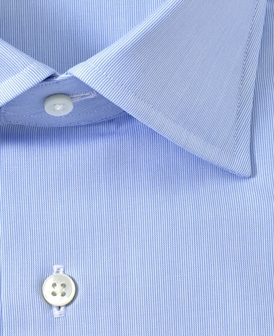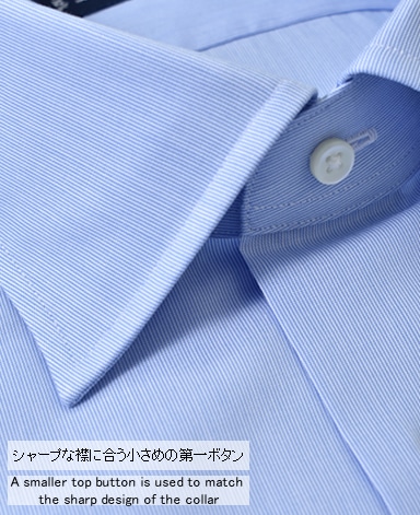 ■襟の表裏のパターンに差をつけ、コンパクトかつ構築的な襟を実現。品の良いドレスシャツの証である、首に巻きつくような内巻きフォルムは、匠によるいせ込み技術の成果です。