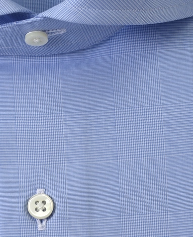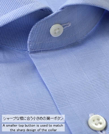 ■襟の表裏のパターンに差をつけ、コンパクトかつ構築的な襟を実現。品の良いドレスシャツの証である、首に巻きつくような内巻きフォルムは、匠によるいせ込み技術の成果です。