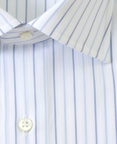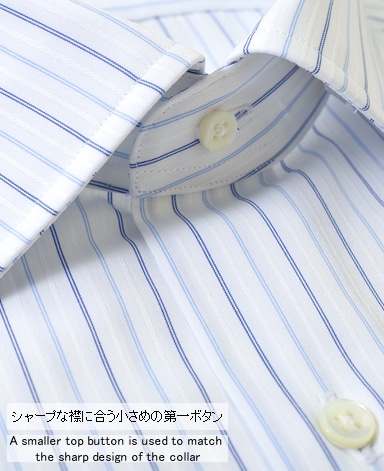 ■襟の表裏のパターンに差をつけ、コンパクトかつ構築的な襟を実現。品の良いドレスシャツの証である、首に巻きつくような内巻きフォルムは、匠によるいせ込み技術の成果です。