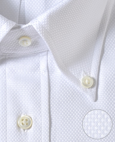 ■襟の表裏のパターンに差をつけ、コンパクトかつ構築的な襟を実現。品の良いドレスシャツの証である、首に巻きつくような内巻きフォルムは、匠によるいせ込み技術の成果です。