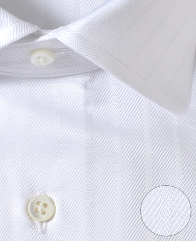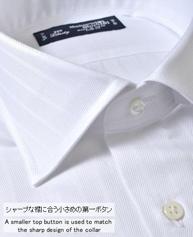 ■襟の表裏のパターンに差をつけ、コンパクトかつ構築的な襟を実現。品の良いドレスシャツの証である、首に巻きつくような内巻きフォルムは、匠によるいせ込み技術の成果です。