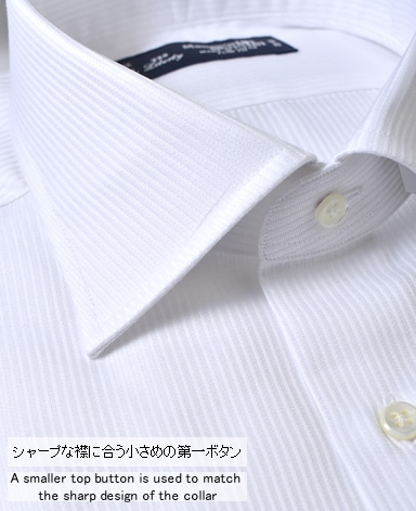 ■襟の表裏のパターンに差をつけ、コンパクトかつ構築的な襟を実現。品の良いドレスシャツの証である、首に巻きつくような内巻きフォルムは、匠によるいせ込み技術の成果です。