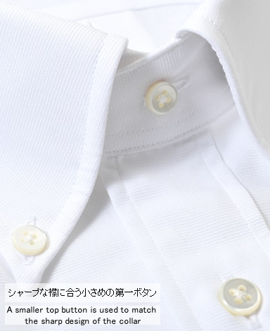 ■襟の表裏のパターンに差をつけ、コンパクトかつ構築的な襟を実現。品の良いドレスシャツの証である、首に巻きつくような内巻きフォルムは、匠によるいせ込み技術の成果です。