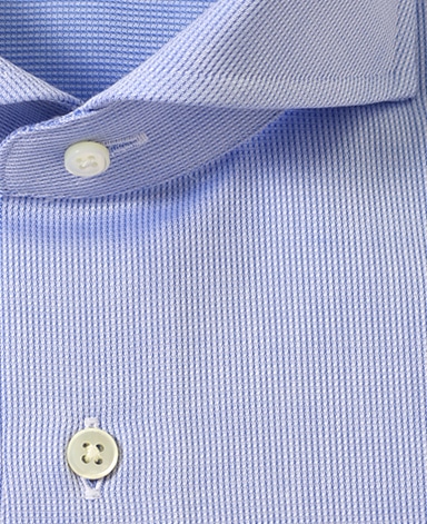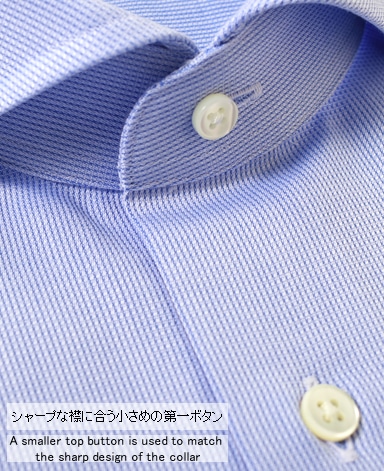 ■襟の表裏のパターンに差をつけ、コンパクトかつ構築的な襟を実現。品の良いドレスシャツの証である、首に巻きつくような内巻きフォルムは、匠によるいせ込み技術の成果です。