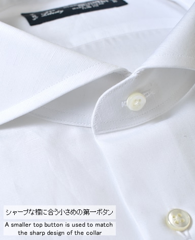 ■襟の表裏のパターンに差をつけ、コンパクトかつ構築的な襟を実現。品の良いドレスシャツの証である、首に巻きつくような内巻きフォルムは、匠によるいせ込み技術の成果です。
