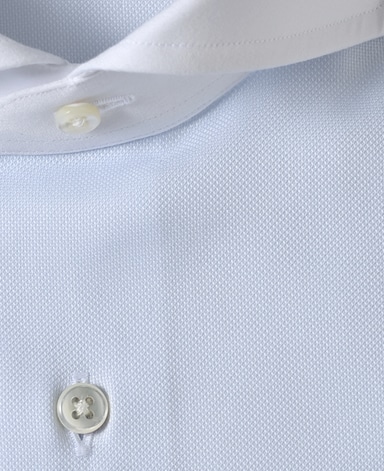 ■襟の表裏のパターンに差をつけ、コンパクトかつ構築的な襟を実現。品の良いドレスシャツの証である、首に巻きつくような内巻きフォルムは、匠によるいせ込み技術の成果です。
