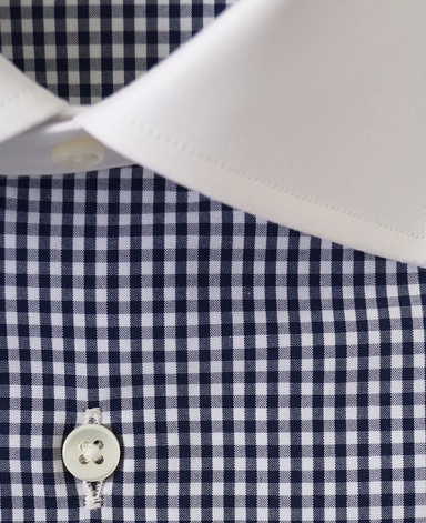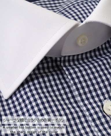 ■襟の表裏のパターンに差をつけ、コンパクトかつ構築的な襟を実現。品の良いドレスシャツの証である、首に巻きつくような内巻きフォルムは、匠によるいせ込み技術の成果です。
