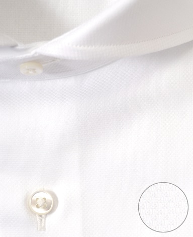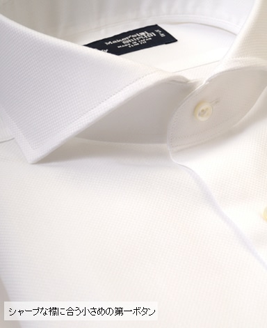 ■襟の表裏のパターンに差をつけ、コンパクトかつ構築的な襟を実現。品の良いドレスシャツの証である、首に巻きつくような内巻きフォルムは、匠によるいせ込み技術の成果です。