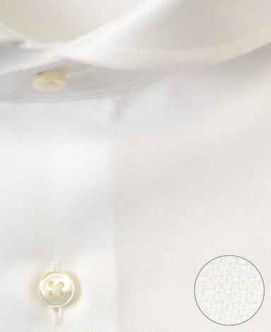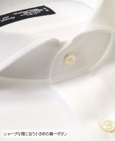 ■襟の表裏のパターンに差をつけ、コンパクトかつ構築的な襟を実現。品の良いドレスシャツの証である、首に巻きつくような内巻きフォルムは、匠によるいせ込み技術の成果です。
