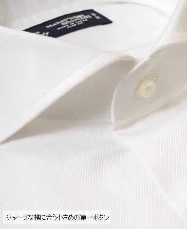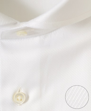 ■襟の表裏のパターンに差をつけ、コンパクトかつ構築的な襟を実現。品の良いドレスシャツの証である、首に巻きつくような内巻きフォルムは、匠によるいせ込み技術の成果です。