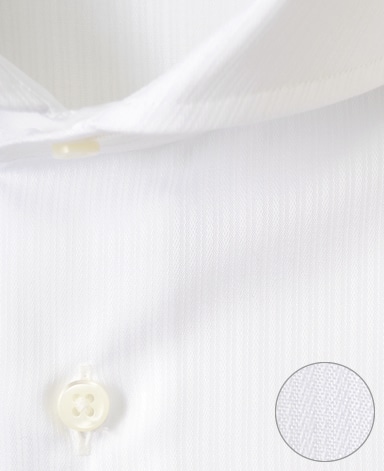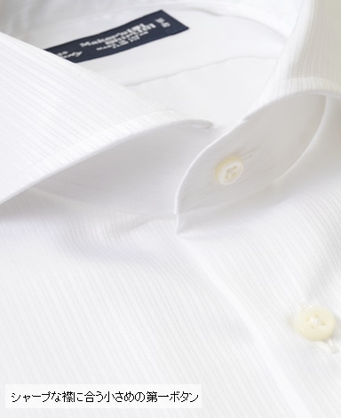 ■襟の表裏のパターンに差をつけ、コンパクトかつ構築的な襟を実現。品の良いドレスシャツの証である、首に巻きつくような内巻きフォルムは、匠によるいせ込み技術の成果です。